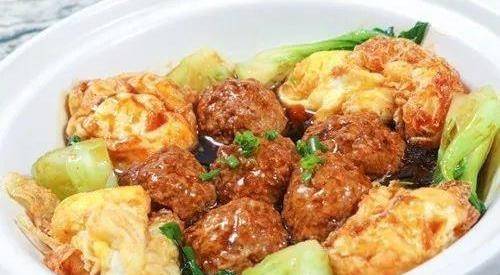 4、锅下高汤烧开,下入狮子头、炸鸡蛋,调味后小火烧制至入味,勾薄欠出锅,摆入上海青,撒上葱花即可。