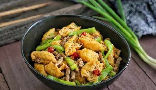 1,猪肉切丝,豆腐泡一分为二,准备好少许的红辣椒,不喜辣的可以不要,青椒切丝。