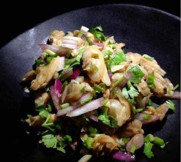 蚬子肉、香菜、洋葱、米醋、生抽、蒜、辣椒油、香油、盐;