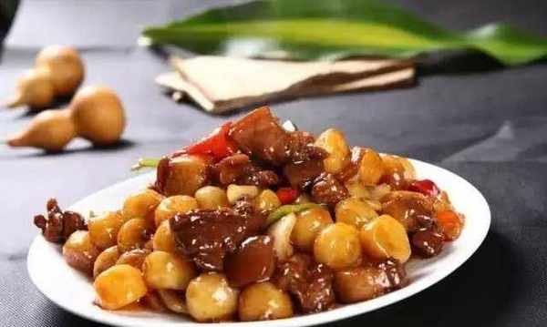 4、锅留底油,将干辣椒节和干红花椒炒香,依次加入生姜、大蒜、京葱炒香,下鹅肝,倒入提前调制好的料汁,翻炒片刻,加入琥珀腰果即可盛入毛椰中。