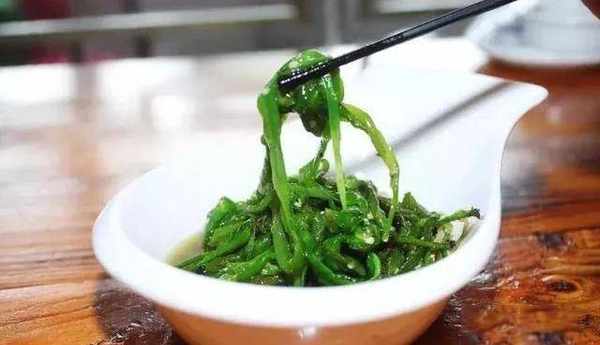 1.热锅上油,辣椒先过大油炸成虎皮辣椒,之后立即用清水清洗,冷却,剥皮,手撕成条状,备用。