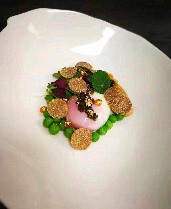 2、甜豆仁煮熟后剥掉外皮,轻轻打入鸡蛋,旁边放入甜豆仁,做好的白玉菇及酱汁倒在旁边,最后在温泉蛋上点缀鱼籽酱,在青豆上放上黑松露,即成。