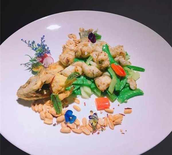 3.荷兰豆、西芹、百合飞水后,加入XO酱,与鱼片、青红椒一起翻炒均匀即可,与炸好的鱼骨一起装碟摆盘。