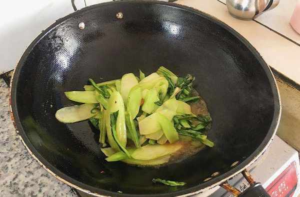 3️⃣当莴苣炒得萎缩一些,逐渐进油变色,倒入小半碗纯净水,微微煮一两分钟,帮助更好熟透;