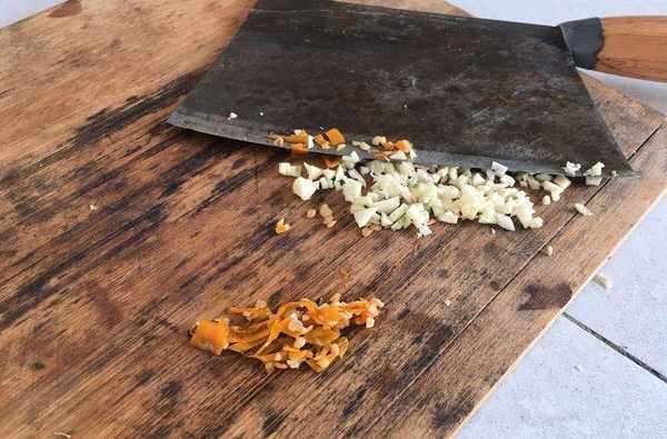 1️⃣将莴苣梗上的皮用刀削掉,然后横切或者斜切成均匀薄片,大蒜、干辣椒剁成细末;