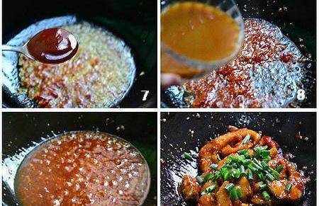 ⑦放入番茄酱炒上色。