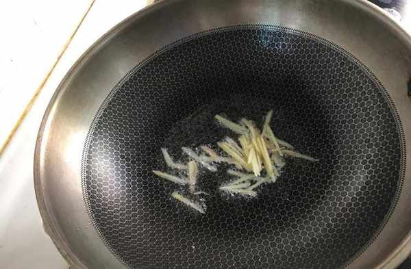 3、加热锅,锅中放入适量的油,油温8分热放入姜丝在锅中爆香,姜丝炒香后放入小鱼干在锅中翻炒。