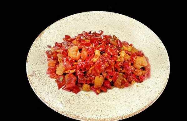 起锅烧热油,油温5成热,放入干辣椒节炒成棕红色,捞出,再倒入鸡丁煸干水分。