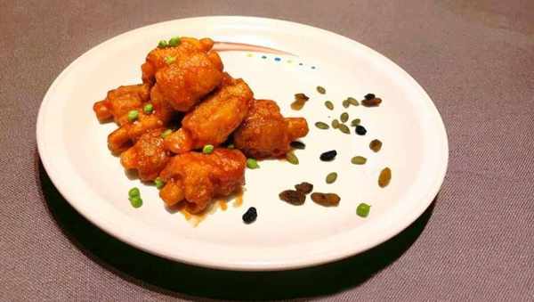 锅留底油,放入番茄汁炒出酸味,加入白糖、白醋熬制浓稠,放入炸好的素排骨挂汁后装盘即可。