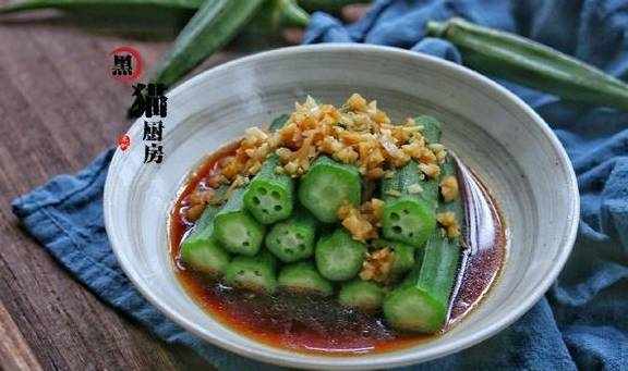 把做好的蒜末酱汁淋在汆烫熟的秋葵上,这道菜就完成了。