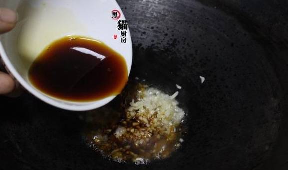 7.一勺生抽加小半碗清水调匀后倒入锅内,与蒜末一起煮开即可关火。
