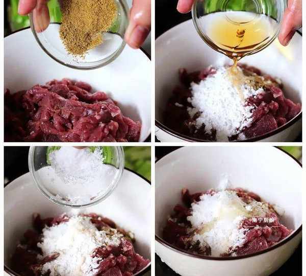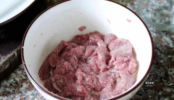 1、市场上买回来新鲜的牛肉切成片状,然后往牛肉当中加入适量的孜然粉、淀粉、料酒、食用盐。