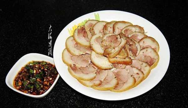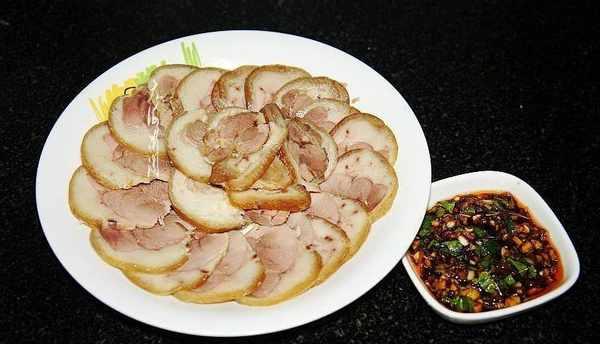 冷藏后随时都可以端上桌哦!吃的时候切成片,大蒜去皮洗净切碎,加点生抽、醋、蚝油、糖调成料汁,喜欢辣口味的可以加点辣椒油,再加点香菜末,蘸料汁吃,好吃不腻,超级完美!方便又省事。