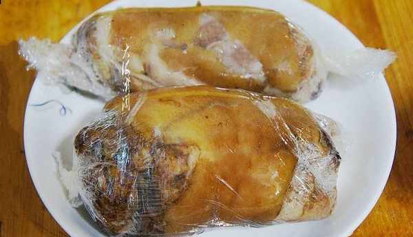 然后把肘子捞出来,控净汤汁,剔除骨头,注意完整地保留肘子皮,在案板上铺上一层保鲜膜,把肘子肉放在保鲜膜上,用保鲜膜把肘子卷起来,尽量卷得紧实一些,把卷好的肘子放入冰箱冷藏4小时以上。