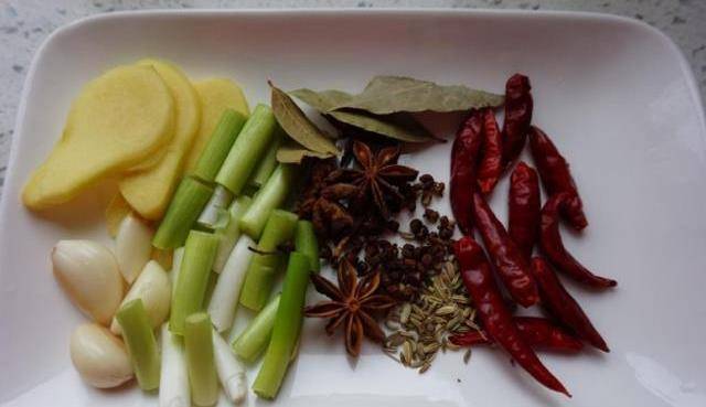 配料:生姜、大蒜、冰糖、花椒、干辣椒、香葱、生抽、香叶、桂皮、八角、沙姜、朝天椒。