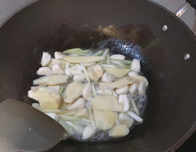 4.炒制卤料,先用油炒化冰糖,再倒入姜蒜炒出香味。