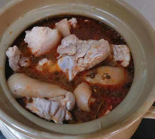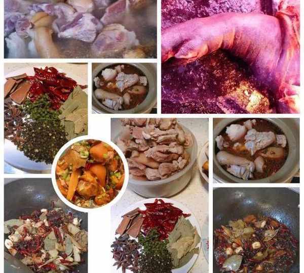 7.卤水烧开后倒入砂锅,把焯水后的猪脚放进砂锅慢慢卤入味。