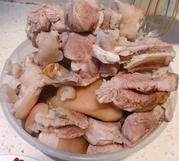 2.把烧过的猪脚用刀刮洗干净,砍成块用水焯一下备用,焯水时加料酒去腥味。