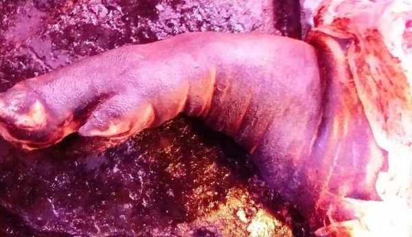 1.买了一只大猪蹄,让卖肉的老板烧得焦焦的,烧过的猪脚不仅沒毛,还格外的香。