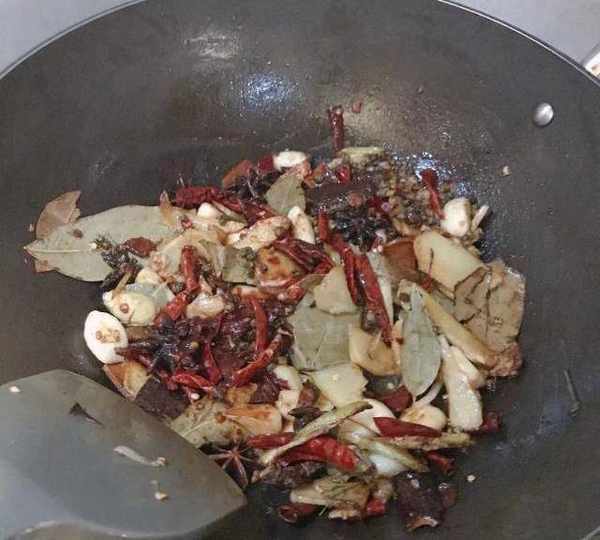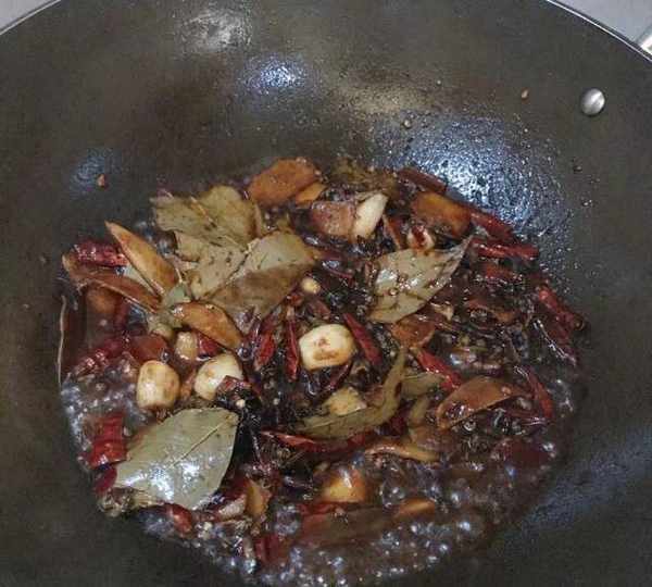 5.再倒入干花椒、干辣椒、桂皮、香叶、八角炒香,最后放入豆瓣酱、生抽和老抽上色。