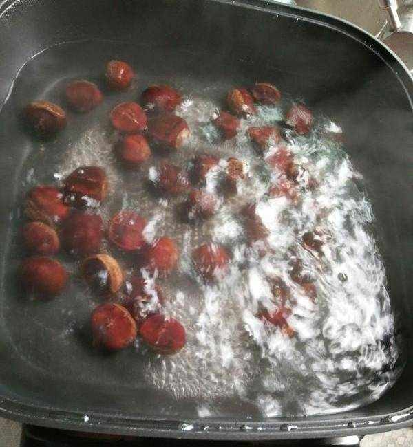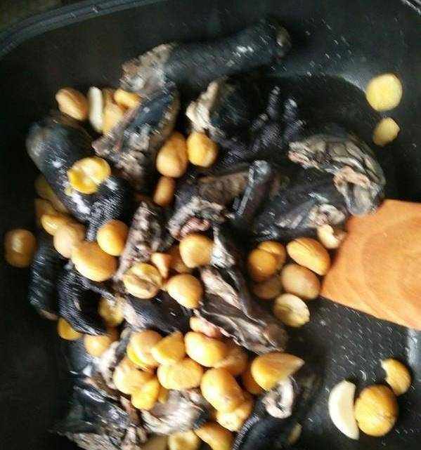 乌骨鸡半只、板栗350克、乌骨鸡一只、板栗适量、和田玉枣4个、枸杞10克、精盐适量、枸杞适量、蒜四瓣、姜半只、食用盐适量、食用油适量、料酒适量