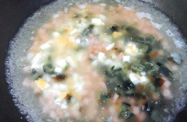 3.煮白菜的时间,我们来把皮蛋啊,咸鸭蛋啊,全部切和或火腿一样的小丁。有的皮蛋品种可能里面是软的,那么就稍微煮一下定型,再剥皮切丁。高汤,我这里面用的是,之前煮鸡腿剩下的高汤,如果没有也不要紧的。可以用浓汤宝来制作高汤。