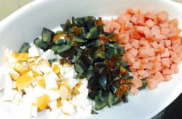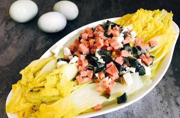 1.将娃娃菜洗干净,对半切开,再对切,一个白菜切3刀就行了。火腿切丁备用。皮蛋和咸鸭蛋剥皮备用。