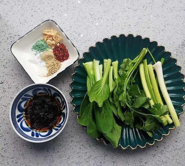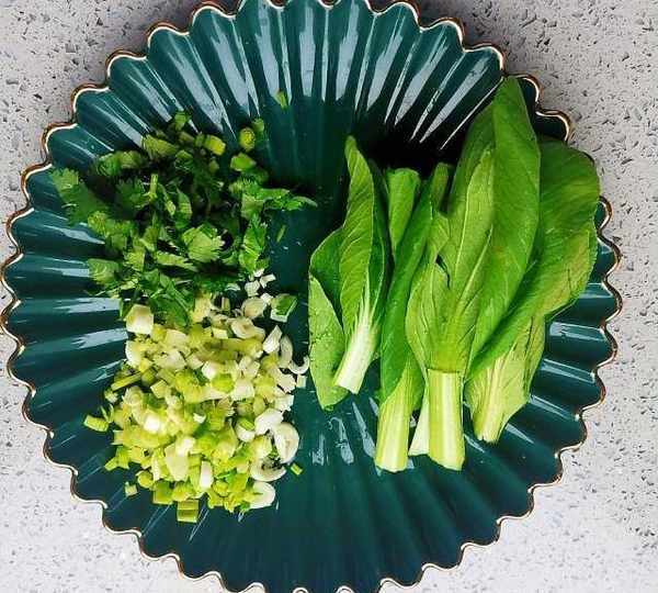 第4步、蒜苗,香菜切末,小青菜洗净备用。