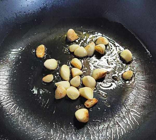 第9步、锅再次烧热,倒少量油,下大蒜爆至微焦。