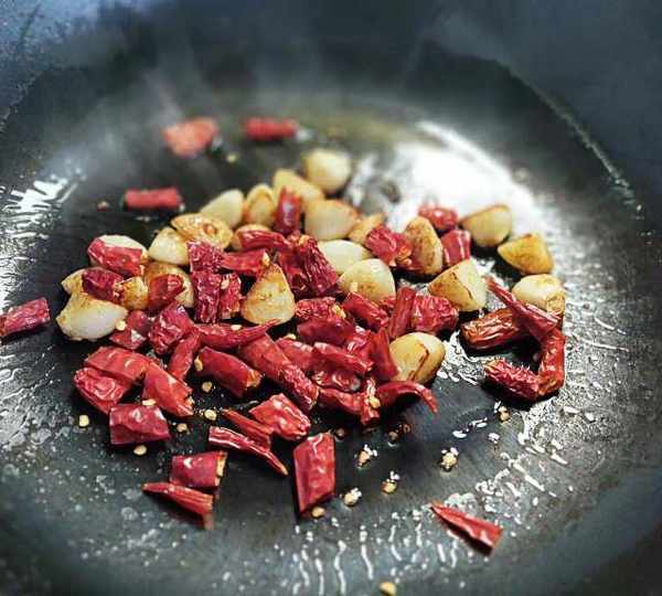 第10步、倒入干辣椒煸炒一两分钟。火不要太大,中小火。