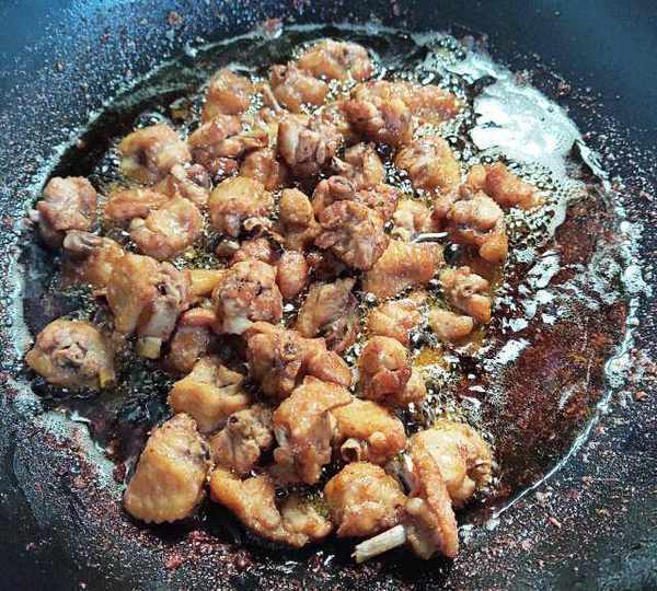 第11步、将前面炸好的鸡肉回锅煸炒两分钟。