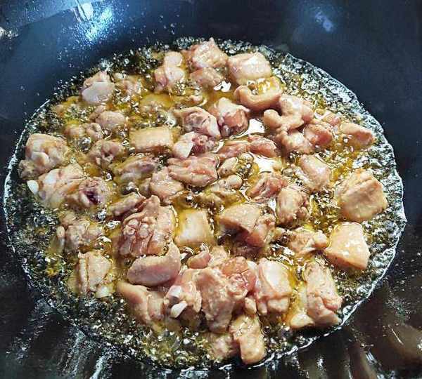 第7步、锅烧热,倒入适量(要能没过鸡块)菜籽油,加热到可以看到油起波纹了,倒入鸡块,注意腌鸡的水不能倒入,会溅油。