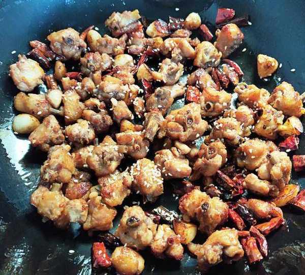 第12步、撒一些熟的白芝麻,翻炒几下就可以出锅了。生芝麻一下子怕不熟,有生芝麻味。