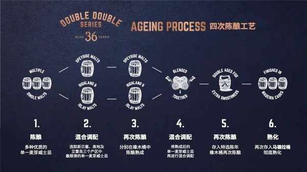 随后将需要的原酒统一调配,存入特选橡木桶中陈酿,吸收陈年橡木桶的色泽和气息;最后再转入马德拉桶(Madeira Cask)等风味桶收尾熟化,进一步丰富酒液的风味细节,获得顺滑的口感和香气。Double Double系列也成为了如今帝王最炙手可热的产品,凭借丝绸般顺滑的口感而广受追捧。