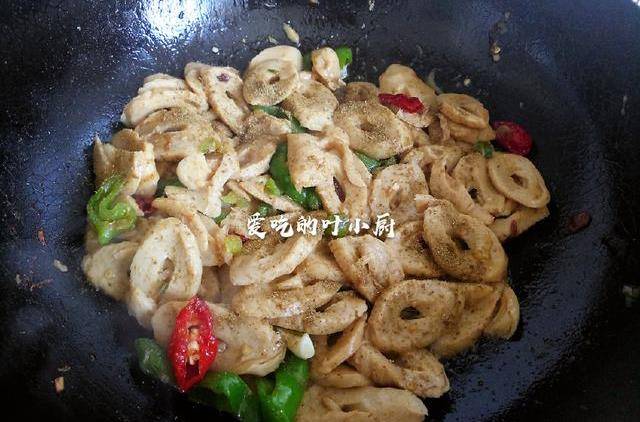 4.辣椒炒出辣味后,把面筋放入锅中一同翻炒。