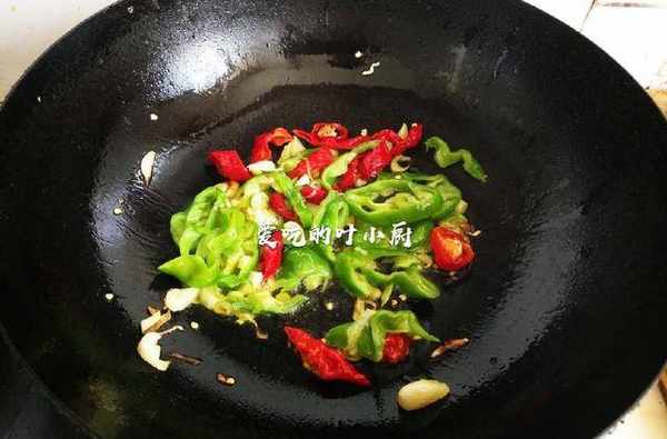 3.葱花和蒜片炒出香味后,把青辣椒和红辣椒放入锅中爆炒。
