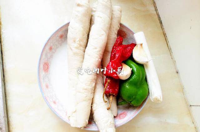 【所需食材】:四根水面筋,一个青椒,两个红椒,一段大葱,几颗蒜瓣。