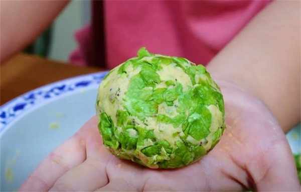 3.这时候再放一些花生油,现在基本上做好了,咱们开始做形状,直接揪一小块面团,在掌心反复的抓匀了,然后用另一个手的大拇指,直接怼个洞进去,边旋转边按压,这个就是窝头。