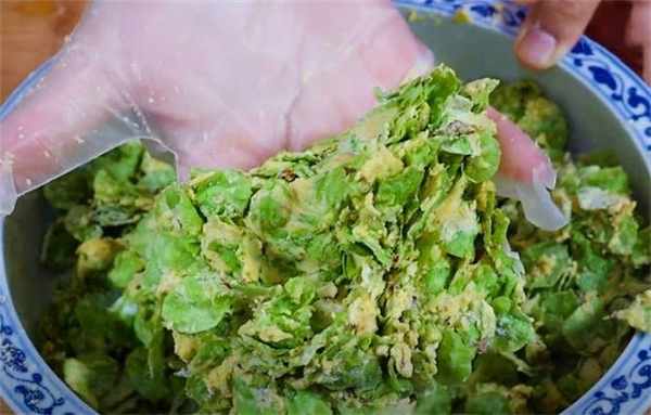 2.把这个榆钱稍微控控水分倒在盘子里,然后开始少量多次的加一些玉米面,再放一些面粉,来一些十三香、食盐调味,再放上2g的小苏打,戴上手套直接抓匀了,这样比较方便,抓到这样下手一捏,它成团的程度就可以了。