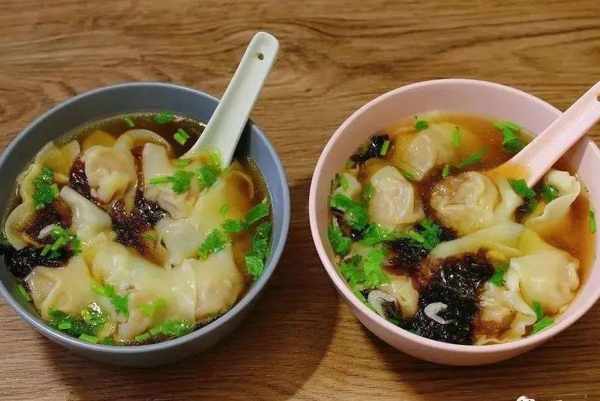 碗中放香菜、生抽、香醋、盐、香油、胡椒粉、紫菜、虾米进行调味,馄饨煮好之后,先舀一勺汤,把佐料融化,再舀入馄饨。