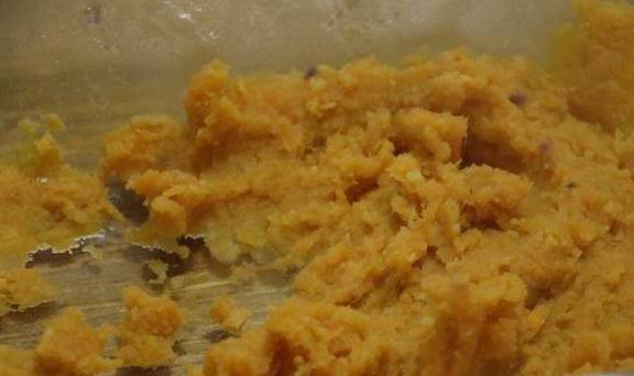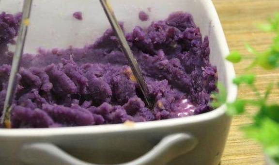 紫薯和红薯分别切成薄片,放入水中煮熟,煮熟后再将红薯和紫薯分别压成泥。