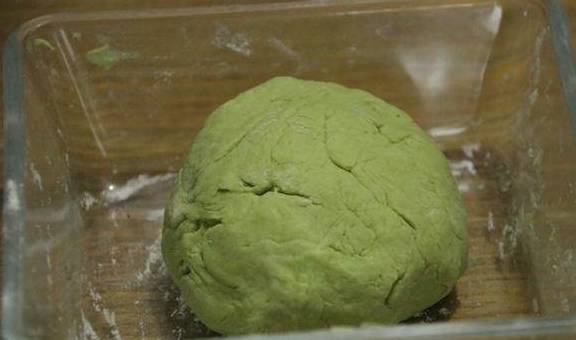 一份面粉中倒入菠菜汁,然后用筷子搅拌,形成面絮后,再用手揉成绿色的面团。