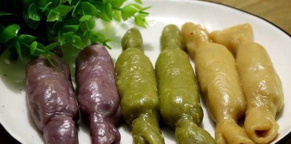 往剩下的红薯泥中加入适量的白砂糖搅拌均匀,放入三种颜色面团小剂子中间,然后卷起来,两边再卷一下,形成一个糖果的样子。