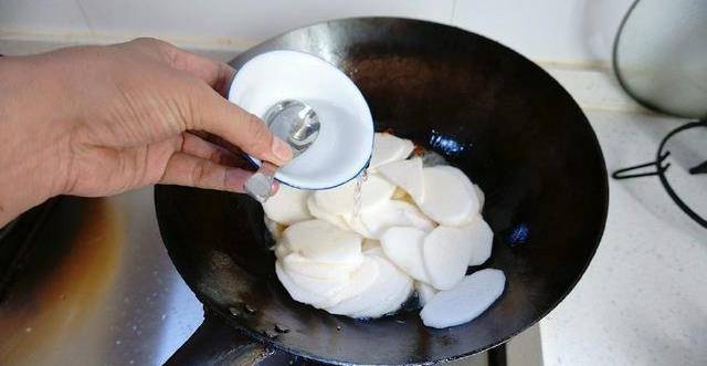 4.在锅里倒油,放辣椒炒香后,往锅里加入山药片以及调好的味汁,快速翻炒让山药片入味。