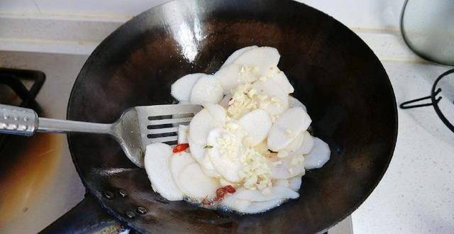 5.炒至山药片透明断生后,撒入蒜粒翻炒匀称即可。