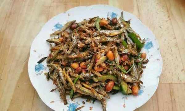 1、小鱼干清洗干净,倒入油锅炒至酥脆的状态。