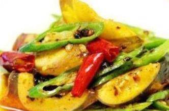 7. 锅中放适量油,先炒香辣椒,然事放入海笋段略翻炒。
