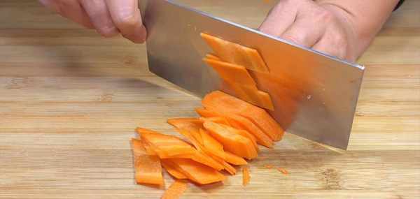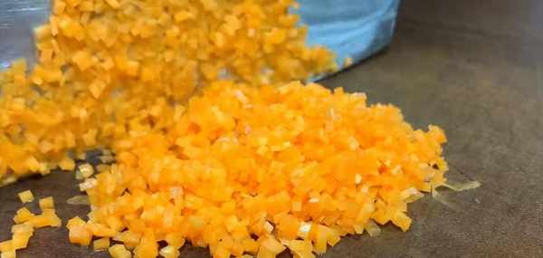 4、准备半根胡萝卜,削去外皮,洗净后切成细丝,再改刀切成小碎丁。