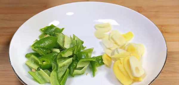 3、青椒去掉籽,切成小块,生姜去皮切片,大蒜洗净切片,放入盘中。