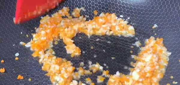 8、起锅烧油,放入蒜末胡萝卜丁,开大火快速地翻炒,把食材炒出香味。